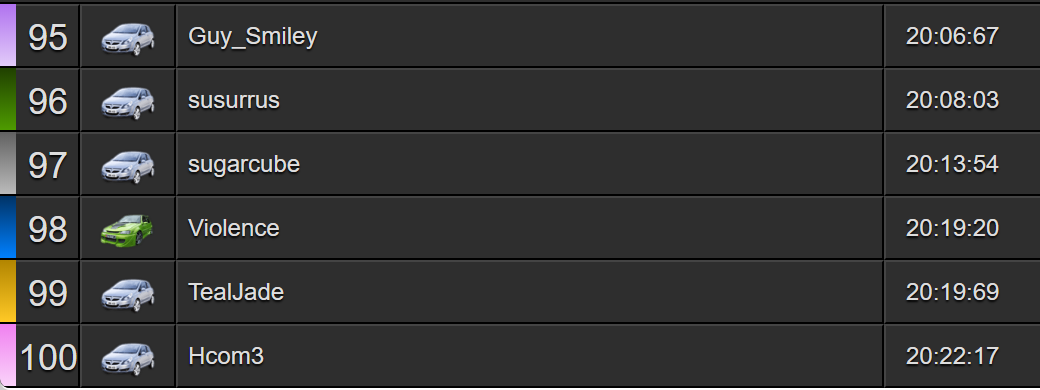 Eventual loser Hcom3 spent barely any time outside of the bottom three in the first half of this race, trundling around Speedway in his Vauxhall Corsa like a snail with ME. He took the last position towards the end of lap one, and although URT Semi-finalist Violence pushed him close, Hcom3 managed to regain the disadvantage as his dedication to lethargy won out, with the Torn City Times reporter finishing three seconds behind his closest challenger TealJade.