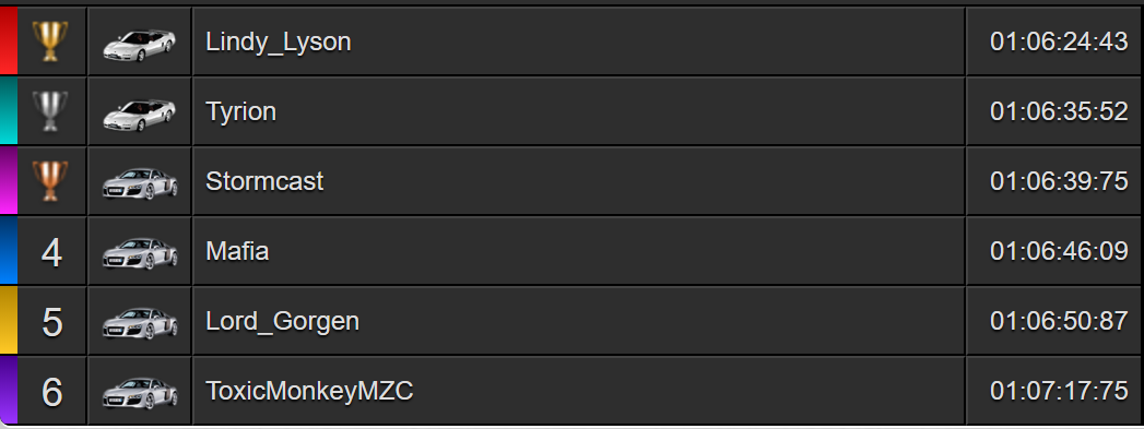 Mafia, Tyrion and Lindy battled for supremacy amongst themselves until Stormcast entered the mix, with all four swapping places until well past the halfway stage, as Lord_Gorgen and ToxicMonkeyMZC failed to keep up with their speedier rivals. On Lap 30 Lindy_Lyson started to dominate, with the order of Lindy, Stormcast, Tyrion, Mafia, Lord_Gorgen and ToxicMonkeyMZC barely changing until Stormcast regained the lead on lap 37.