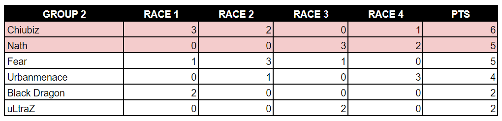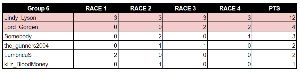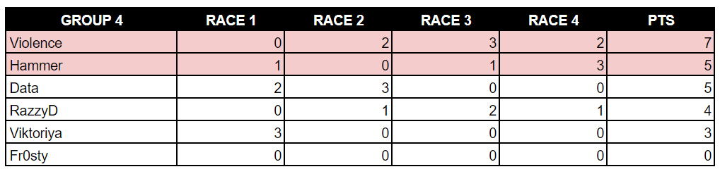 Group 4 also had five drivers potentially able to qualify, yet with Data and Violence leading on five points apiece, a one-two finish would see them both through. Data got out of the blocks fastest but was soon caught by Hammer, who himself needed to win and hope either one of the two leaders finished points-less. This is precisely what happened, as Hammer won ahead of Violence in second, whose two points meant he qualified as group winner. RazzyD rallied to overtake Fr0sty on the final lap and snatch third by half a second, with Data having to settle for fifth. This meant second-place was tied between Data and Hammer, with the latter going through thanks to a shorter Cumulative Time of 100:32:96 compared to Data's 101:09:65 - Hammer's 42-second advantage in this race proved both naughty and decisive.