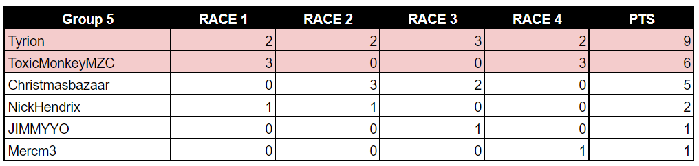 Group 5 saw Tyrion already qualified with a race to spare, and boy could you tell. His awful start saw Mercm3 and ToxicMonkeyMZC fight for the lead throughout most of this race, but the former eventually fell away and was overtaken by a resurgent Tyrion for second. Mercm3's third-place finish was no small achievement, however, with the tournament's lowest-ranked driver clearly able to mix it with the big boys. Christmasbazaar finished out of the points and was leapfrogged by race winner ToxicMonkeyMZC who landed the second qualification position behind group winner Tyrion.