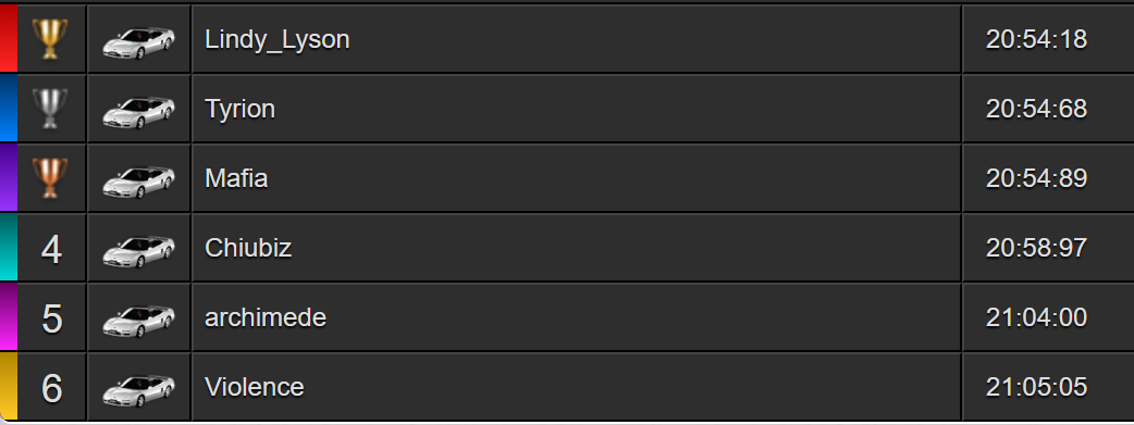 The final lap began with Mafia, Tyrion and Chiubiz out in front, but this was not how it ended. Archimede darted into third position early on, before Lindy_Lyson forced her way into proceedings by shooting up to second. Tyrion overtook Archimede for third and with Mafia out in front, this is how it remained until the final corner of the final lap.