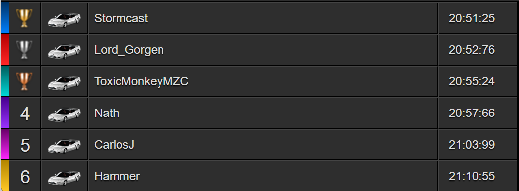ToxicMonkeyMZC had also moved out ahead of his rivals to stake his claim for third, and this was how the race eventually finished, with Nath, CarlosJ and Hammer exiting the competition in fourth, fifth and sixth respectively.