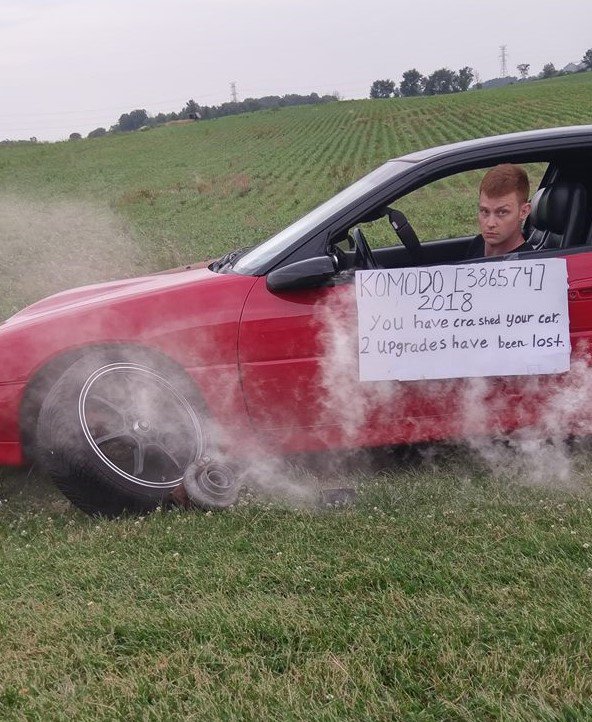 "I did not crash my car for my entry, although it may have been more fun that way. Instead, I lifted the front of the car up with a floor jack, took the tire off and then lowered it back down close to the ground. I then just leaned the tire at an angle to make it look like something broke and also put a spare turbocharger on the ground by the tire. Lastly, I added a smoke bomb from a local firework stand to bring in some special effects."