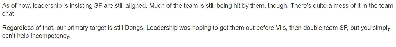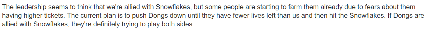 "Assuming what Thief says is true, and the Snowcake alliance is as deeply entrenched as ever, Dongs attacking us and letting Snowflakes run away with all of the tickets is simply prolonging their misery. Seeing all of the Xanax used, cans drank and hotel rooms stayed in all for a futile attempt at salvaging anything higher than third place fills my heart with a deep, inescapable sorrow and my eyes with an uncontrollable flow tears. It does sting to see our closest ally left hang us out to dry like this, but our allies do have a tendency of losing us lives (I'm looking at you, Nasty!)."