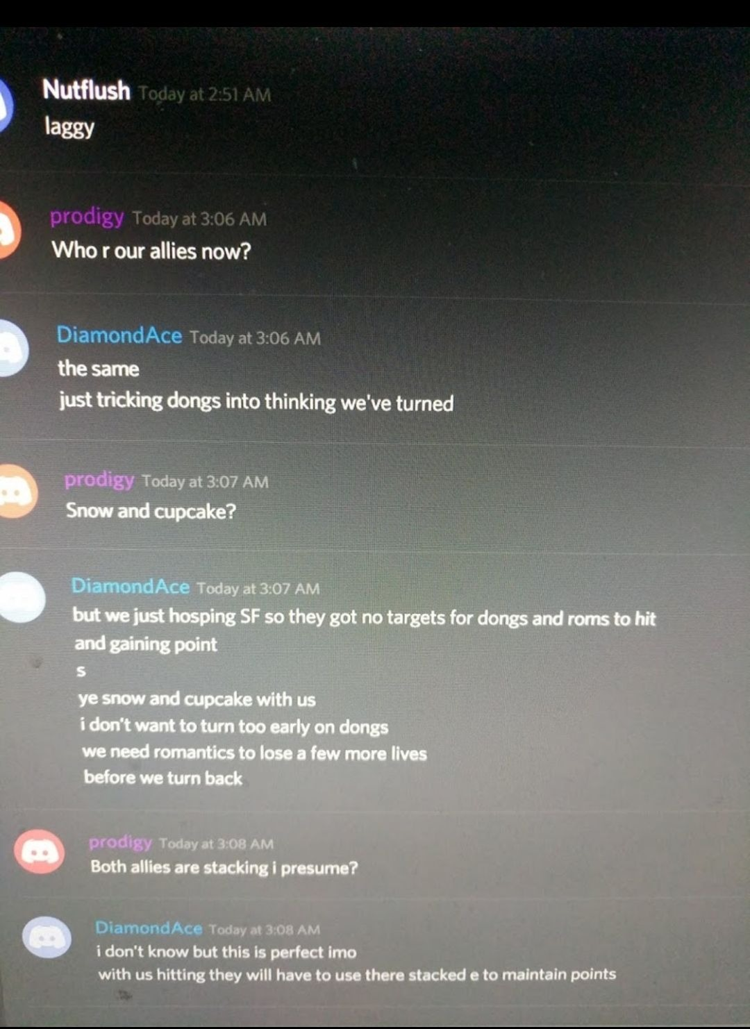 Yet despite appearances to the contrary, it seems the Villains did have some allies left right at the very end, even if they weren't strictly allied. A member of the Villains told me that the Dongs were outed from the four-way alliance around the same time Romantics were targeted. The Villains then tricked the Dongs into thinking they had an agreement, as this image shows:
