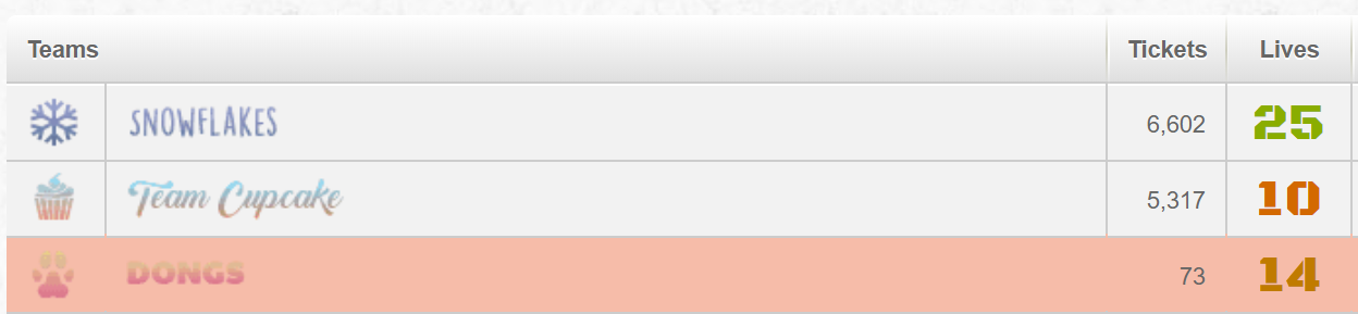 At the time of writing the Dongs look to be withered like an old man's sausage, having lost twelve lives in just over 24 hours. Recovery seems unlikely as they are presently stuck in the drop zone five thousand tickets behind Team Cupcake, shedding lives every hour since Villains were eliminated at 8 am this morning.