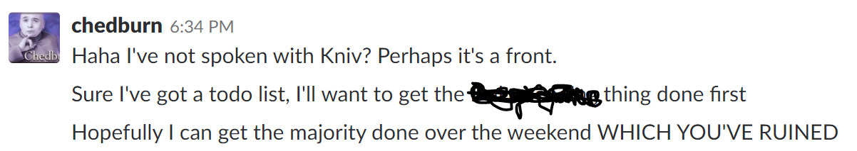 Interesting. Has Kniv been paid off by a rival, or is there a bigger fish involved? It is well known that one of Kniv's goals was to become so dominant that he would one day receive a message from Chedburn asking him to back down to let someone else win. Has this dream come true? Did our city's leader ask our triple tag champion to bugger off and stop being all winningy? The short answer is no.