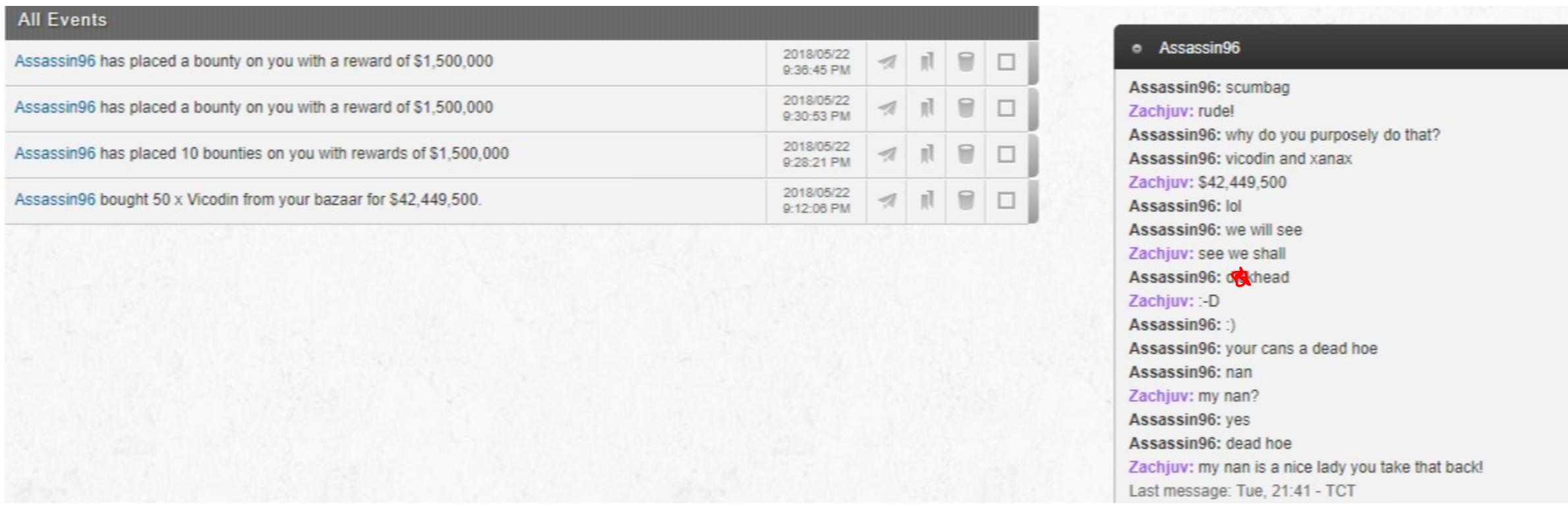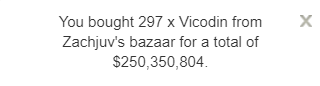 Zachjuv's trick is to mirror his Xanax price (and often the total stock) with that of his Vicodin in the hope that players will accidentally buy Vicodin at Xanax prices. To achieve this, Zachjuv places the overpriced Vicodin in the first slot in his bazaar, with the little white pills looking visually similar if one were to glance at them for only a second. This ruse may sound easy to avoid, but many players new and old fall for it on a daily basis. And rumour has it that at one point earlier in the year, even the mighty Duke was duped by Zachjuv.
