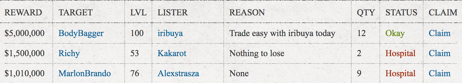 My latest marketing trick is to place a $5 million bounty on BodyBagger along with an advertisement as the reason. A risky venture you may think, but BodyBagger has given me permission to do this, and who in their right mind is going to attack Torn's strongest player for $5 million? This nifty trick means I'll always be at the top of the bounty page so long as I keep this up.