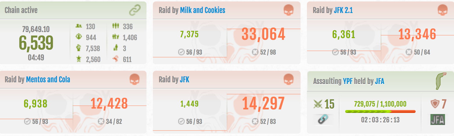 "We knew they were in big trouble when they pulled the masterful strategic move of having all TUN factions raid CR, lol, That kind of salty move only comes when you know your ass is grass. I must say though that JFA and JFA 2.0 are seriously bringing it... we feel bad for them. if the rest of their 'team' fought like they are, this would be a much different story."