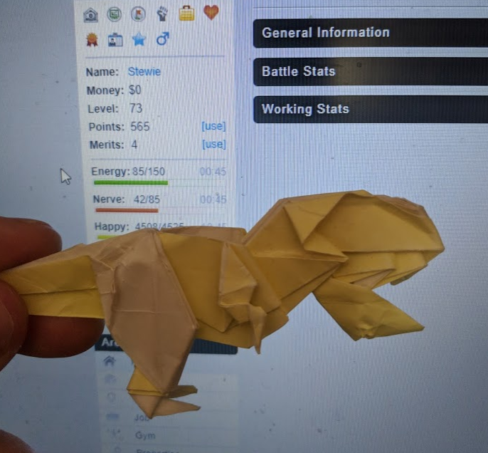 Stewie: "I occasionally, spend time doing Origami (Japanese Art of folding paper). Here is an example of one of the things I managed to follow along with and make - something I've (almost) mastered the instructions for - but I'm not always as successful"