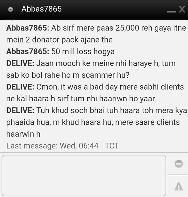 "Today I saw a scam message in trade chat saying invest with me in bookie on cricket it will be 80% chance of getting win I will give you guesses my commission will be 15%. So I contacted him he said me to put bookie on Surrey, Sussex etc 10 mill each. I put all my savings. After few hours I lost all 50MIL. When I PM him he just blocked me."