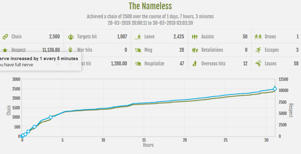 "We had 33 members put together to get 2.5k chain done with levels from 15 to 89 all new to game still. And I don't think that it happen before in torn 33 members getting a 2.5k chain. Think it would be a great story."