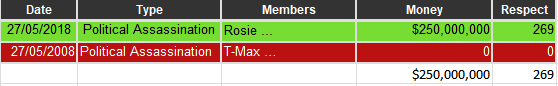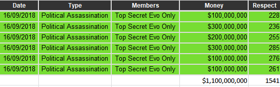 The Organised Crime (OC) Political Assassination (PA) is the pinnacle of criminal achievement for any faction. If you can form a team of four outstanding criminals, successful PA's can earn your faction up to $300,000,000 and 300 respect in just over a week. And in addition to a share of the proceeds, the criminals involved also gain valuable crime experience (CE); this CE gain is the highest skill gain presently possible in Torn.