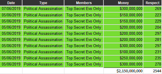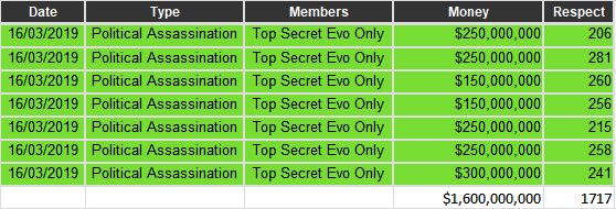 On the 16th of March 2019, we had a clean sweep of seven successful Political Assassinations in one day - our best to date. Our success and the various faction wars boosted recruiting; our relaxed and tranquil faction is gaining popularity.
