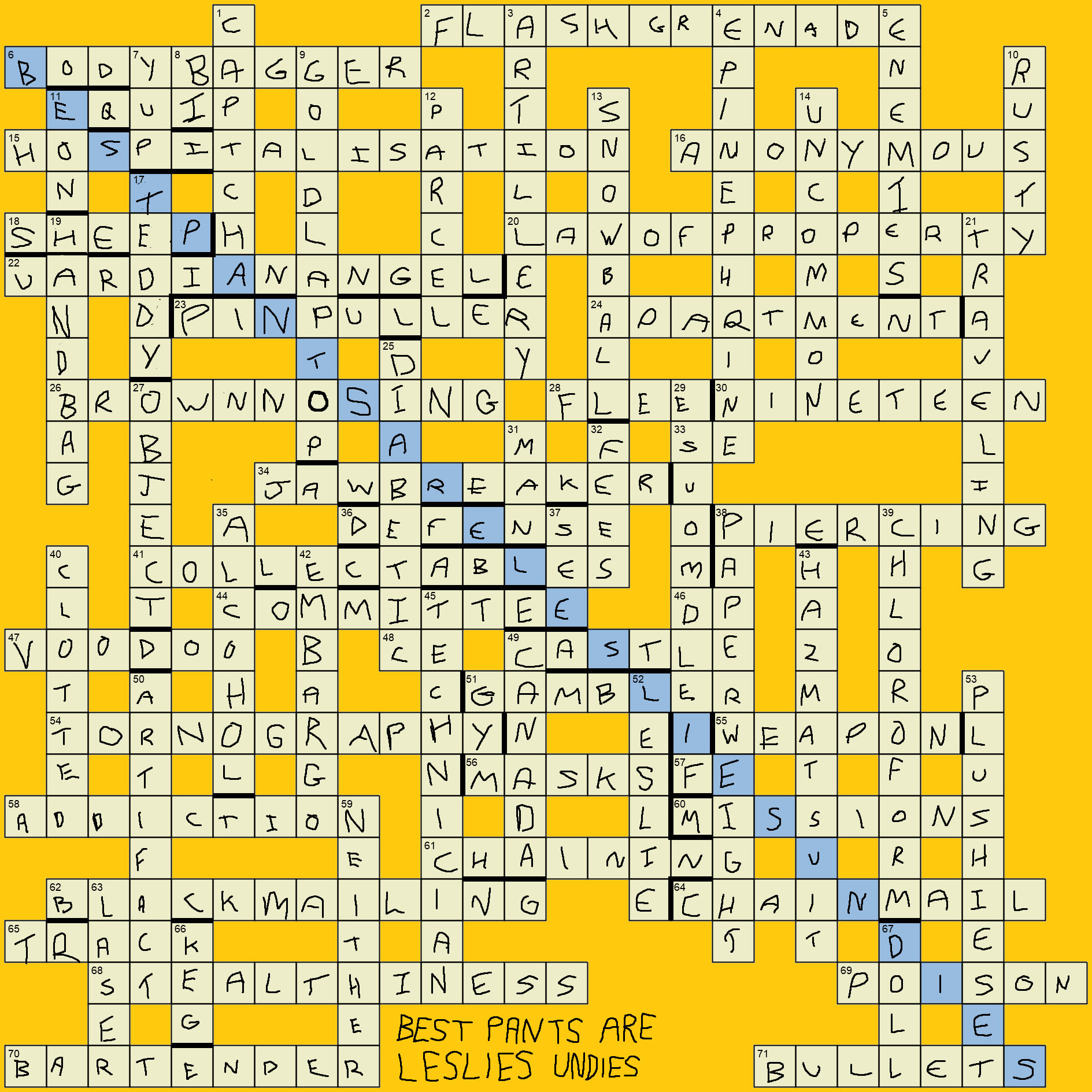 The answer to the previous crossword was: "Best pants are Leslie's undies". And I know this because I managed to loot Leslie's sweatpants while Leslie was not looking.