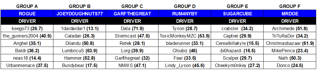 This group is very evenly placed, with only a few points separating the top four in terms of DS. Of this group, crabster has the highest DS with 34.2, but I'd pay serious attention to cheekym0nkey if I were a betting man. Cheekym0nkey came eighth out of thirty-six drivers at the Winter Rally, and it could've been higher if he'd maintained his occasional good form throughout the tournament. CM scored three runner-up spots at Stone Park, Parkland and Docks - the latter being the host for race one tomorrow.
