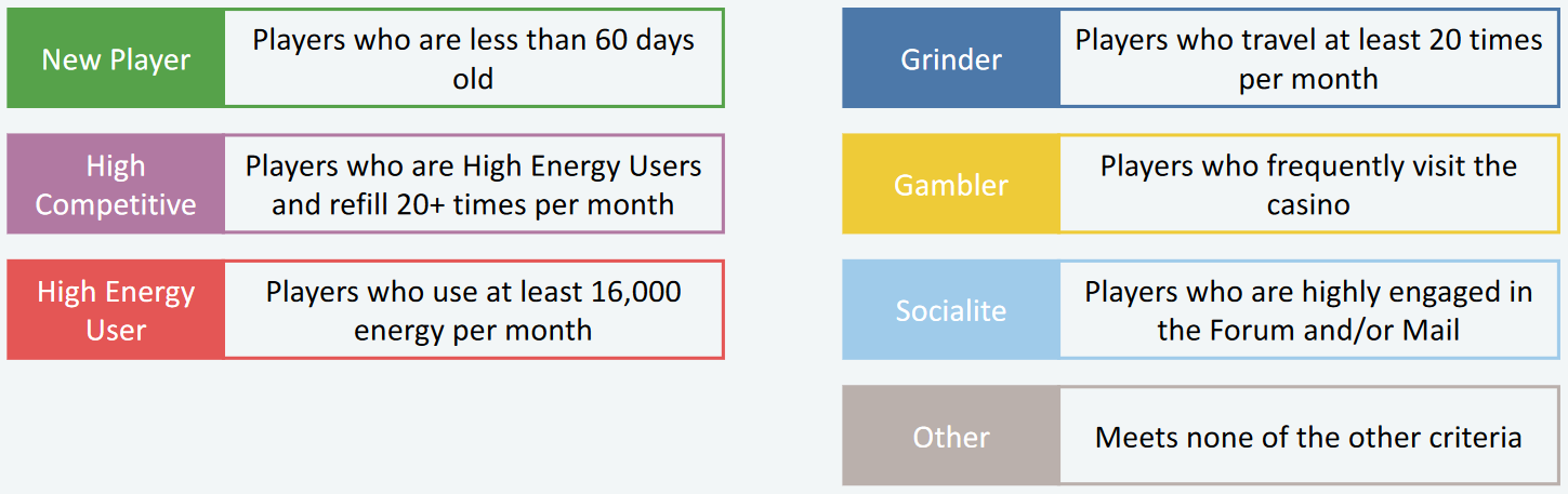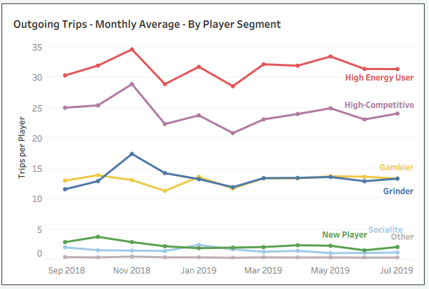 Grinders are defined as players who travel at least 20 times per month. Therefore, you’d think that these players would top the charts when it comes to travelling stats. Not so. High-Energy users make the most with roughly 60 flights per month, but their playstyle is defined by their energy munching instead. High-competitive players also make more flights than Grinders - roughly 50 - with both Gamblers and Grinders making 20-30 flights per month.