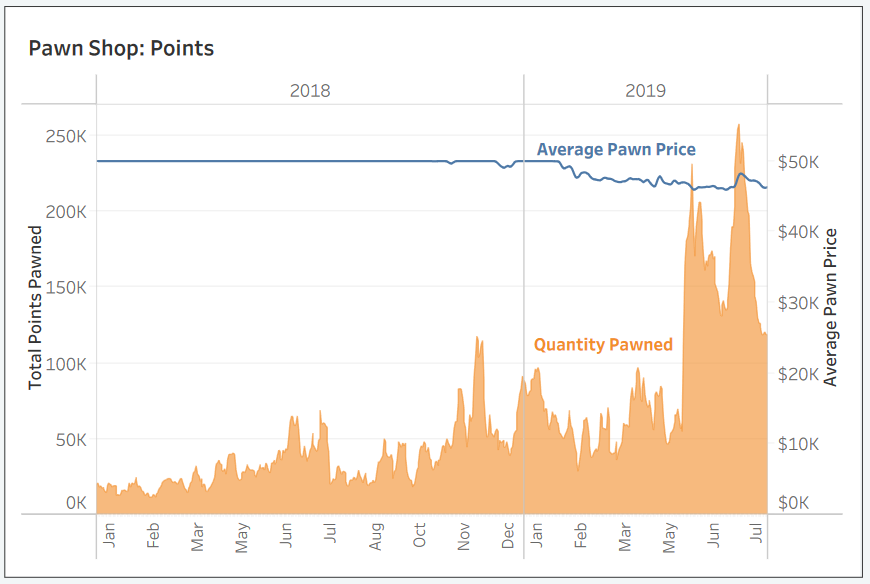 As you can see from that lovely orange graph, there was a spike in the number of points pawned at the time of May’s Museum Day 10% bonus and another spike one month later. Lt_Wolf suggests that the June spike can be attributed to the correlative spike in the pawn price when many players who were hanging on to their points quickly pawned them in response to the pawn price rise. He believes many players prefer the pawn shop over the points market due to the ease of its use and lower risk of getting shaken down by buymuggers.