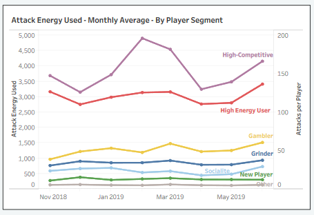 More energy is used at the Gym than anywhere else. However, if you look at the graphs below, you can see that the energy used for Attacks spiked between Jan 2019 and fell throughout March 2019. This period coincides with the Insurgency vs TUN war, and the figures indicate that High-Competitive players who use lots of energy and 20 refills per month were the most involved in this conflict - in second was the cohort of high-energy users.