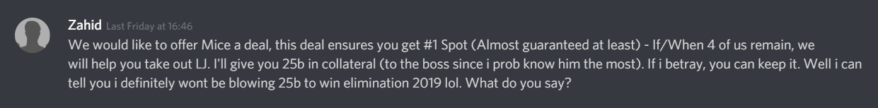 “We knew either FM or LJ would be getting teamed on after they killed us, turns out I was right. Anyways, offered them both deals for us to help them. Both refused thinking they had it all figured out, seems like LJ really did lol.”
