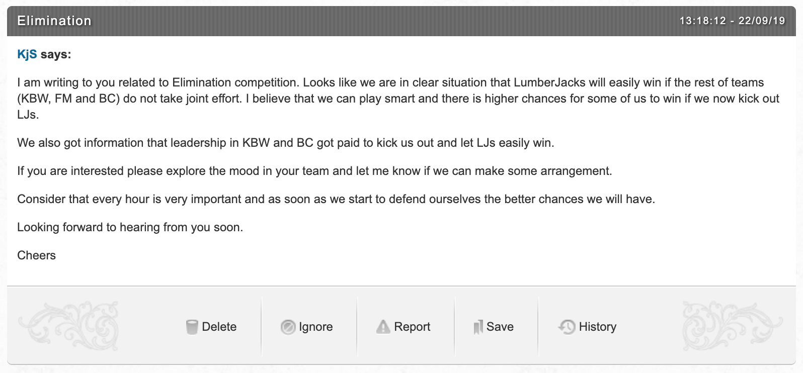Their only chance of survival was to hope Keyboard Warriors didn't have any more chat-stealing scripts in operation, and that their own alliance could keep KW pinned below them. They managed this impressive feat on eight occasions over the next 24 hours, but alas, it wasn’t enough. Dream Team were eliminated at 8pm on the 20th. In hindsight, Swatsicle doesn’t seem to have many regrets about the way DT played the competition, aside from wishing that the other teams had grown a pair of big hairy man balls.