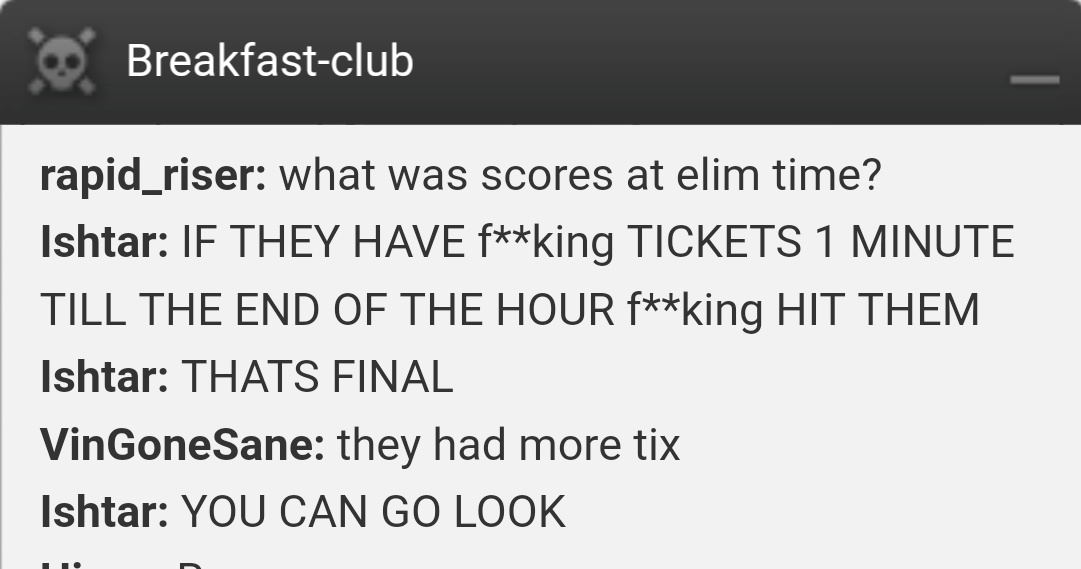 The only reason this scenario won’t take place is if Lumberjacks are trying to prolong the competition by stacking Keyboard Warriors with tickets so they can take them later. Such a situation would help LJs members stand a better chance of obtaining more merits for being among the top hitters in the competition. I don’t think this is likely to happen though, because I just made that reason up as a way of giving Breakfast Club hope.