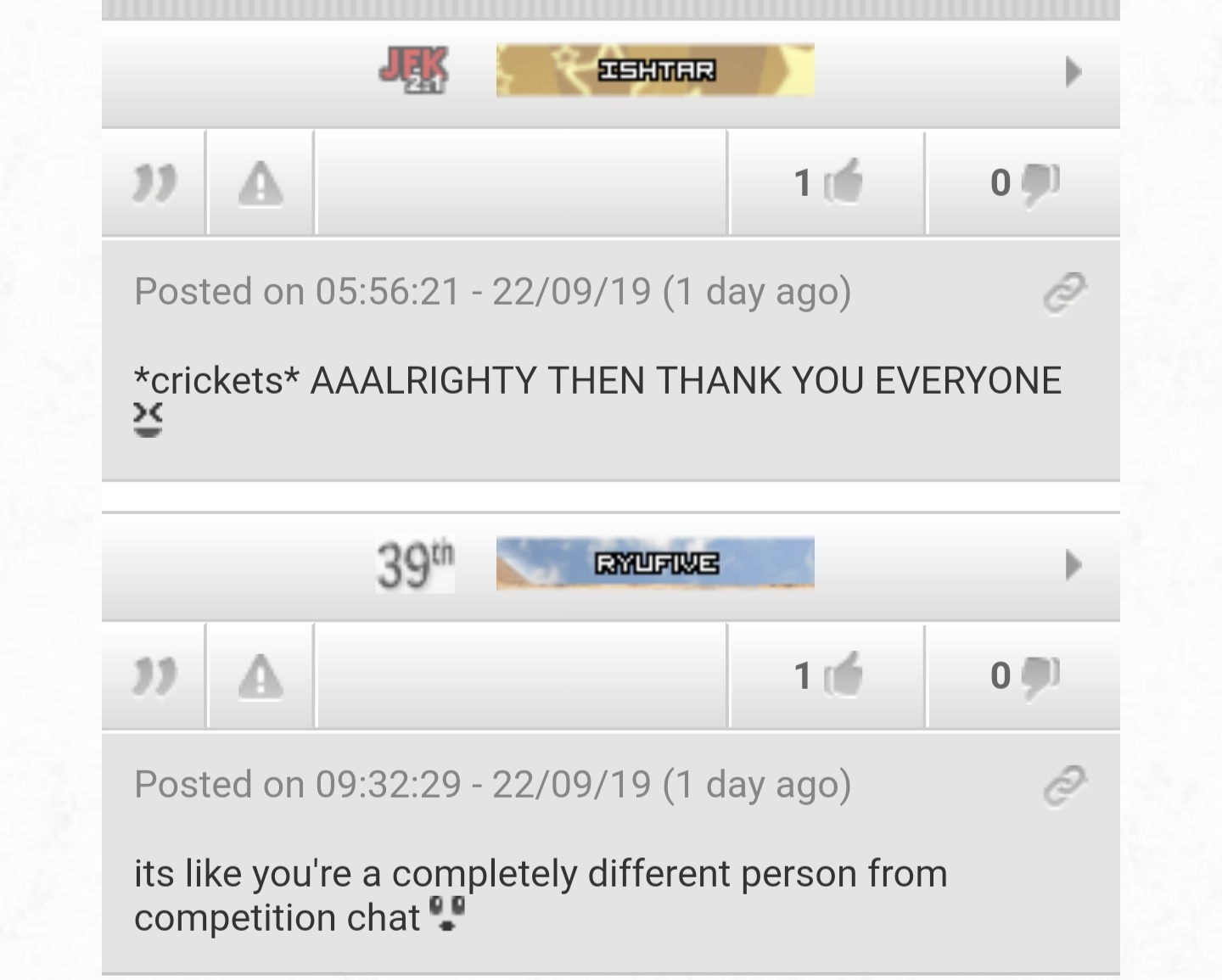 Muttley implied that the deal with Lumberjacks was only formalised at the last minute when Dream Team were about to exit the competition. A comment from KPCSlor of Dream Team also implied the same, as he says Breakfast Club were still working on eliminating Keyboard Warriors right up until the very end of that round. However, when I later spoke to Lumberjacks' MeanMike, he insisted it was indeed the Field Mice who organised Breakfast Club's introduction, not his side, and he didn't much like it at all.