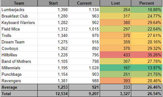 As this is the first year that players have been allowed to leave their teams we don’t have any data to compare from last year. Icebluefire’s calculations below show that 3,327 people left Elimination in total throughout the competition, with the Hillbillies dropping the most having lost 35.26% of their roster of 1,228 players. Incredibly, the team with the most players, Lumberjacks, lost the second-fewest in terms of percentage, as just 264 silly billies departed their ranks, which represented 18.88% of their total members. I guess they didn’t like the smell of victory all that much.