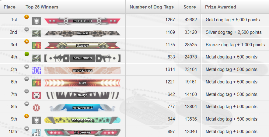 At that point, I knew my chances were good, so I decided to go for it. After a day or two, all of the high-value tags had been taken, so I started taking tags from other players. It just so happened that there were three other factions (SA, R, & FTW) chaining at the start of the dog tags competition. Since those factions were making lots of hits at the start, it was a reasonable assumption that their members had collected a good number of higher value tags.