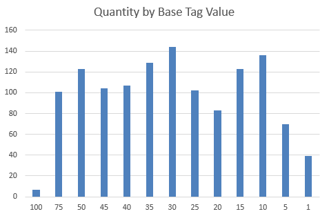I lost about one tag per day on average; not enough to be noticeable. It certainly helps to be #12 in battle stats for both not losing tags and almost unlimited target selection. Overall, I made 1,876 attacks and collected 1,287 tags (finished with 1,267 tags), so the success rate per attack was 69%. I never saw any of the NPC tags, and I only managed to keep seven of the nine Staff tags I originally collected. However, by the end of the tournament, I wound up with 101 out of 488 (21%) of all level 100 tags. This was the overall distribution: