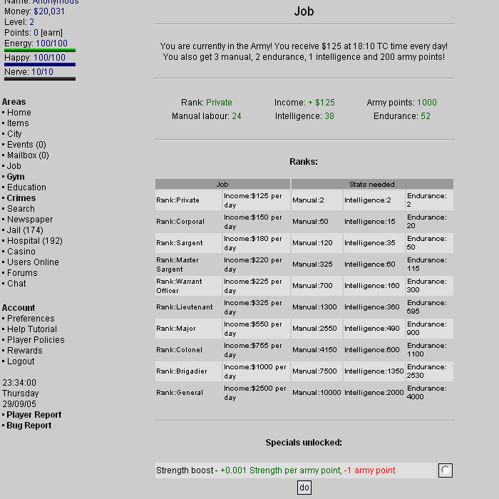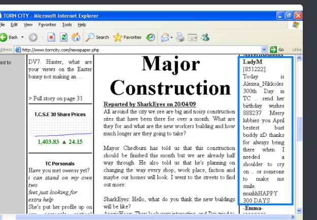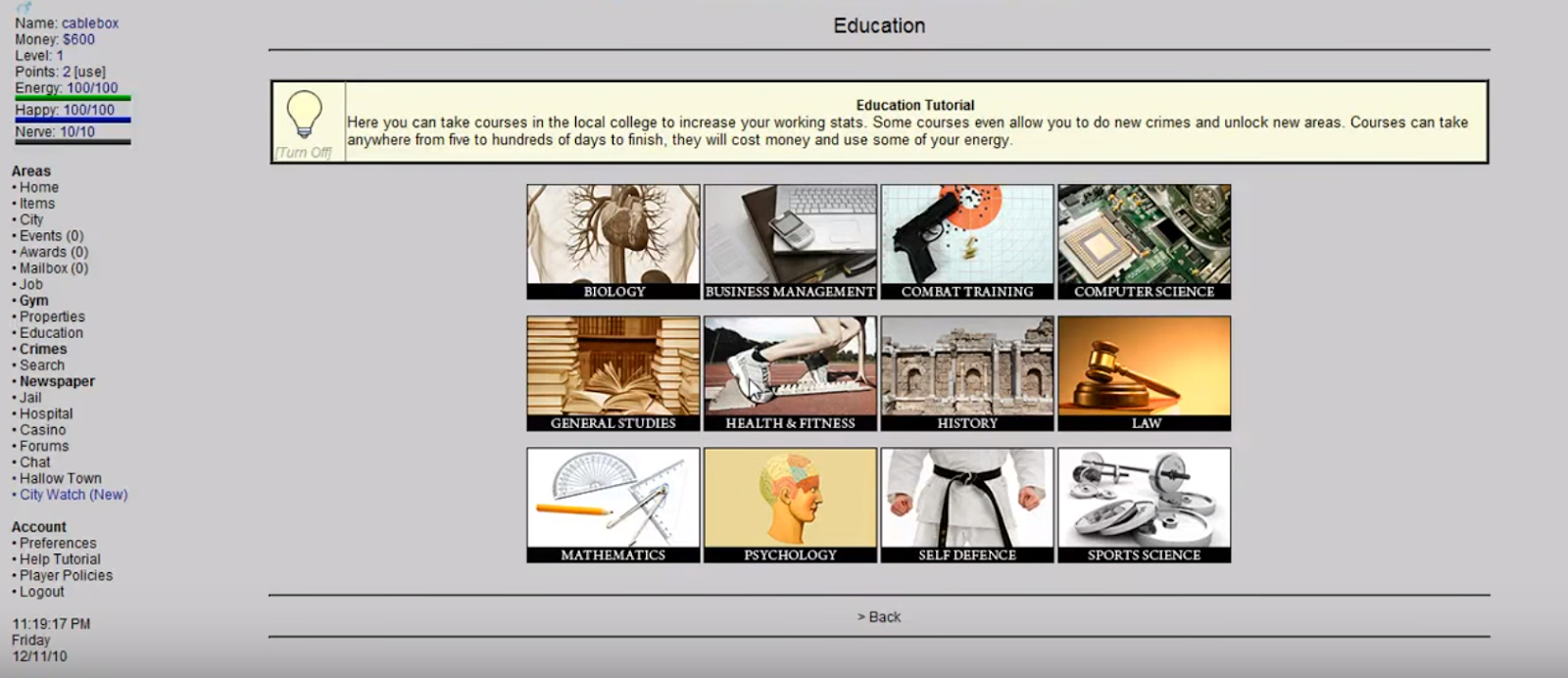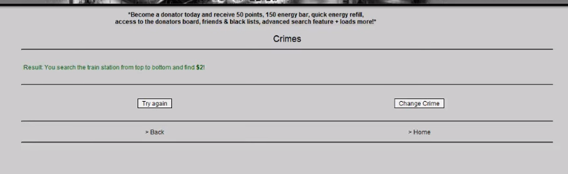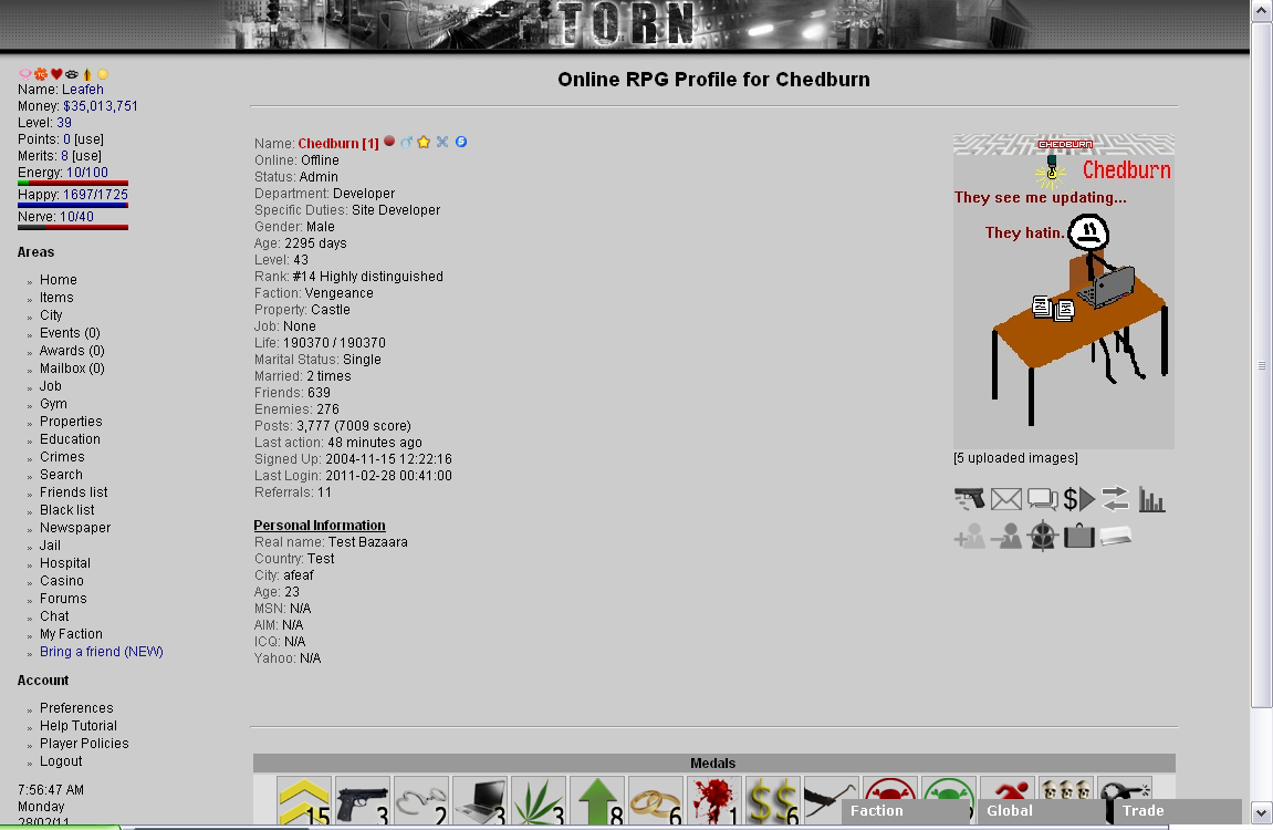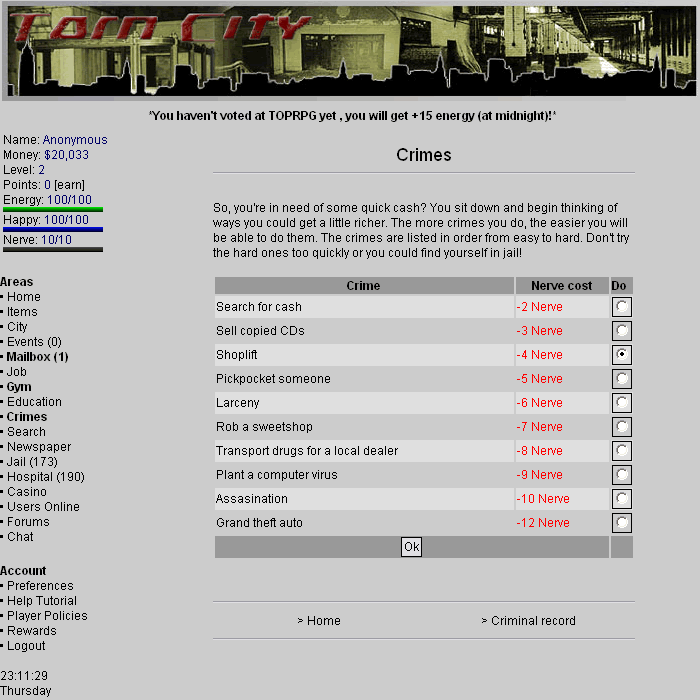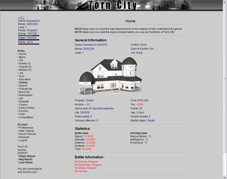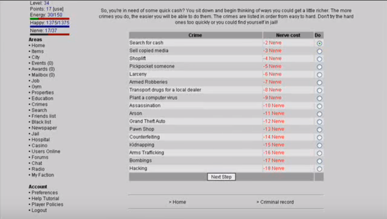 The first hit for Torn City was registered on August 11th 2004, but its official anniversary is November 15th. Anyone who logged in before November would have found what Chedburn described as "a basic shell of a game", consisting of the gym, a few crimes, Big Al's store and a simple attacking system. There were only a few players back then, many of whom were Chedburn's friends. And in its early days, Torn's simplicity was a blessing.