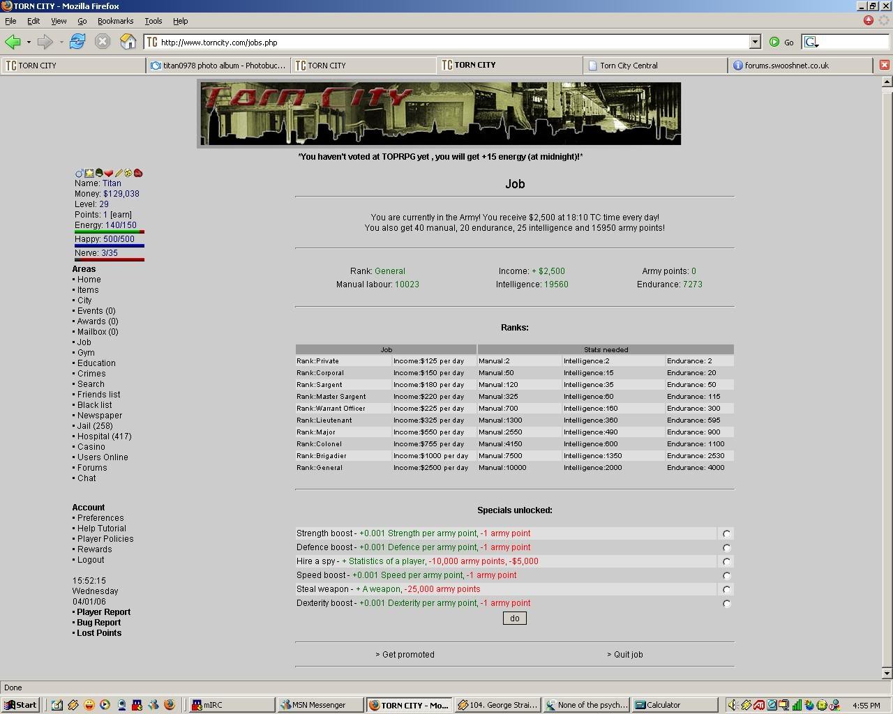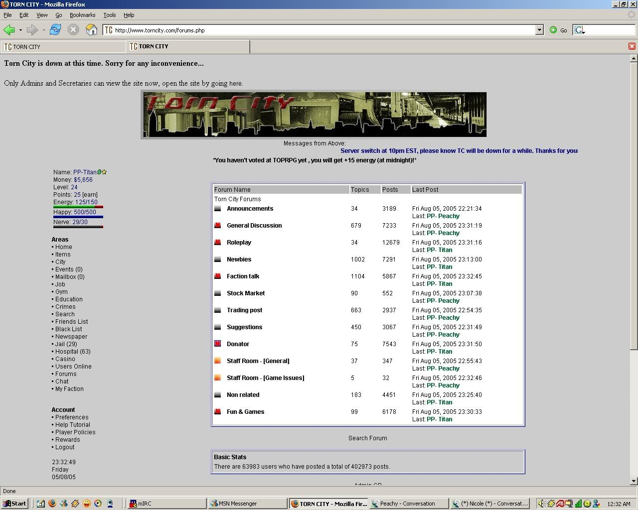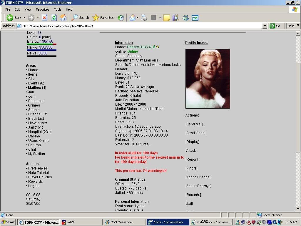 As you can see, Titan is giving us the full retro experience on the taskbar there, with IRC, MSN and Yahoo Messenger all fired up. I often wonder why our generation is too afraid to take phone calls these days, and now I know why - three chat portals open at once? We were deluged, deluged I tell you. And that's before you've even logged into Torn, where the chat with Peachy continues via her profile.