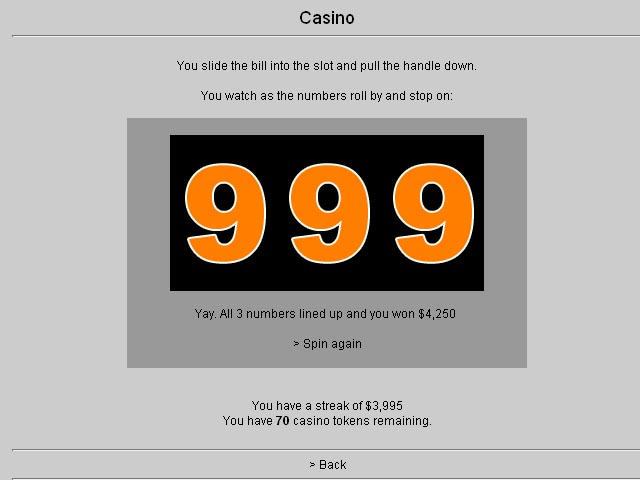 Next up is the Casino, which looks slightly ritzier due to its use of the colour orange. Note how your victory in this simple slots game is signified by the use of the word "yay". Simpler times, eh?