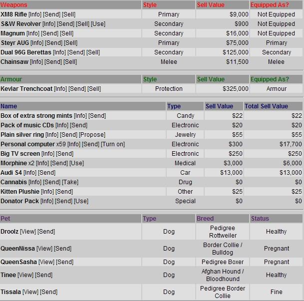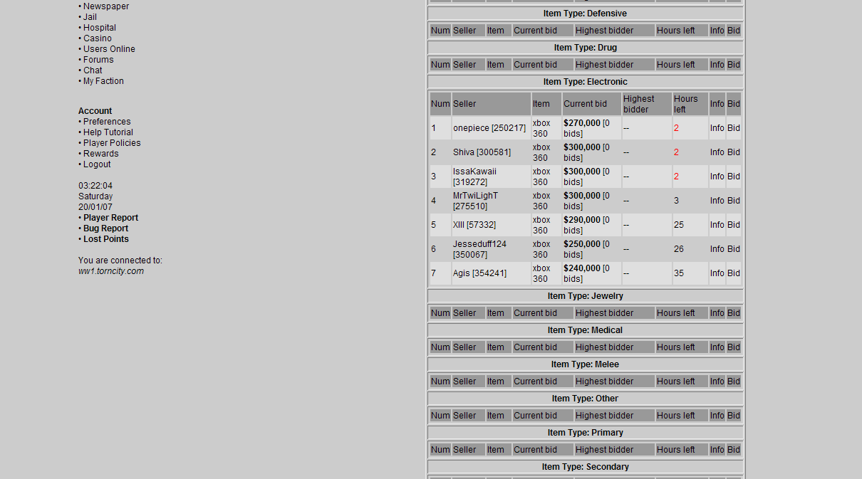 If you're interested in what the 2007 hunting page looked like then here's a shot courtesy of needajoint. But we're going to let Chupacabra give us the final taste of Torn '07 with this tragic day on the stock market, and this neatly categorised items page - note the inclusion of the dearly departed Dongs at the bottom.