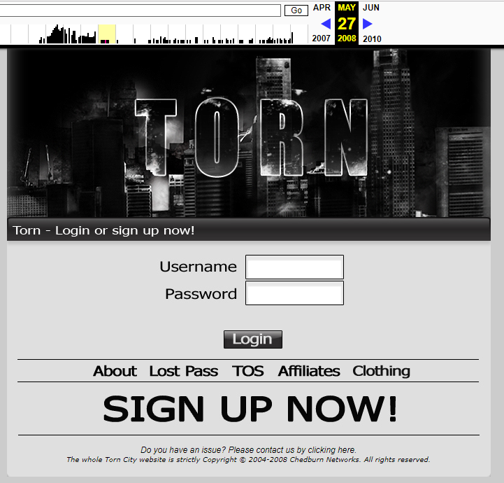 Imagine if you could set your player status to Pregnant. Rainbowsaurus might be pleased, but it'd be quite macabre if you ended up beaten and left on the streets with that status hanging over you. Let's not think about that for too long eh? Moving on, towards the end of 2007 and early 2008 the revamped login page had been ditched, Torn had settled on its preferred font and the word "City" was dispensed with. Their logo isn't too different to the one we know and love (and click on for free stuff) today.