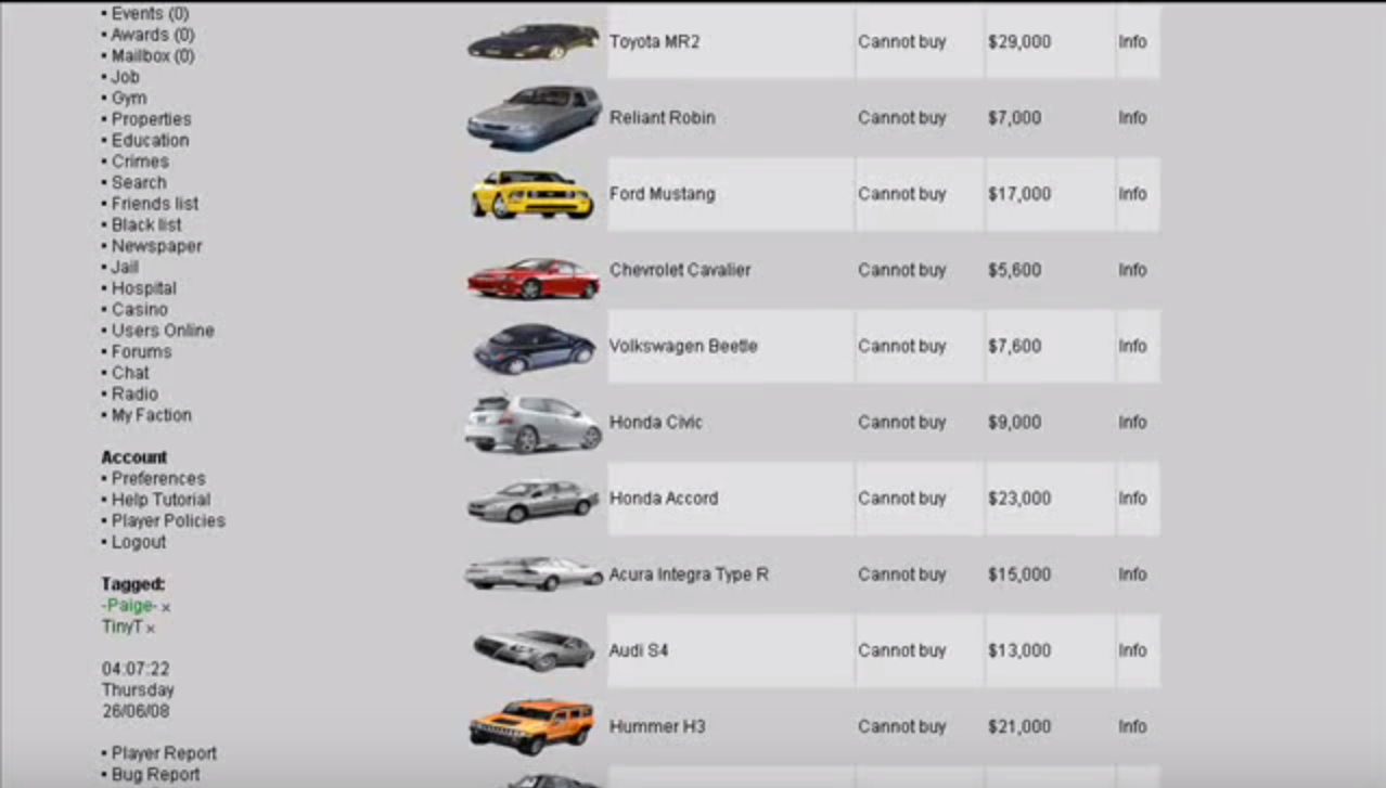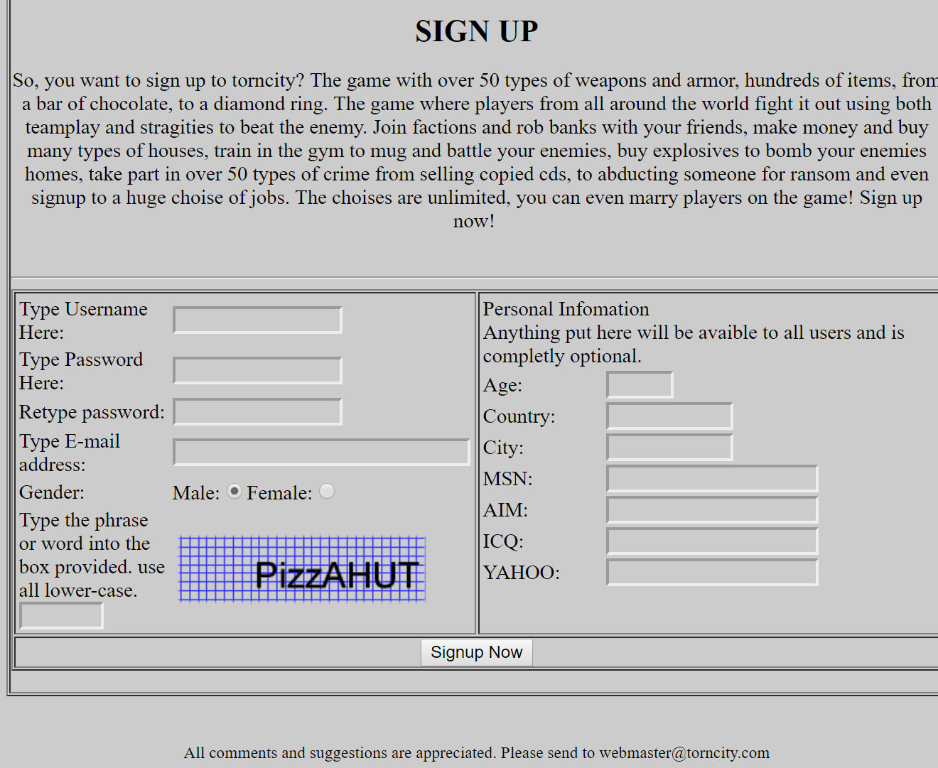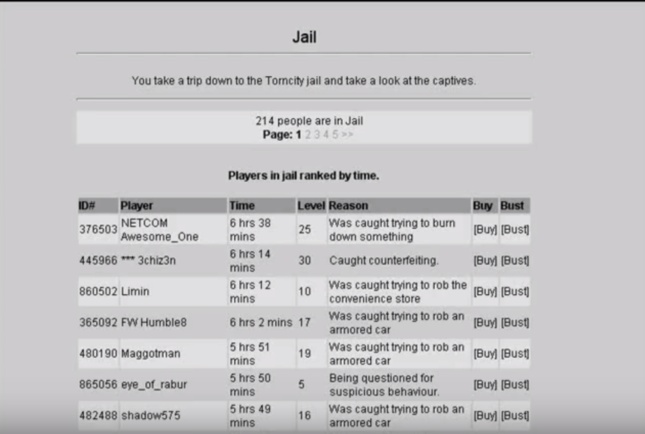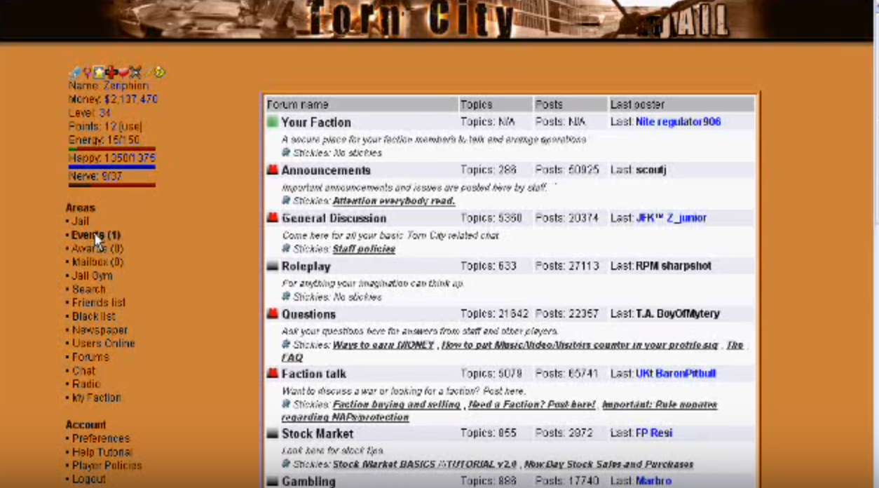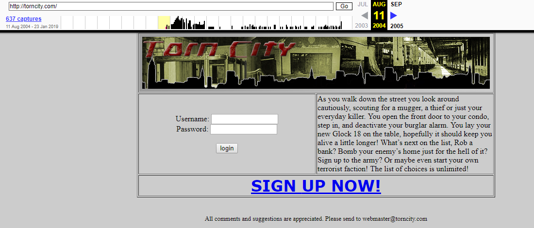 But as more and more features were added, Torn began to grow, and Chedburn started to tinker with the aesthetics of our city too. Thankfully, the internet has preserved many of these old versions of Torn for posterity. As you'll soon see through the sheer number of old screenshots we've acquired, if someone tells you that things online are easy to forget, they’re lying. Some shady guy in a basement is probably keeping a stash of your AOL Mail s**tposts on their Windows Vista right now. The internet never forgets, even if sometimes it might be hard to find old things.