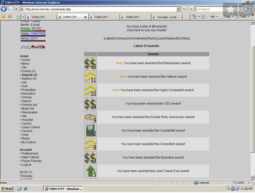 You can see what the home page used to look like when you logged in with a bugged laptop, circa October 2008, courtesy of this screenshot supplied by Ticket. We also have several shots provided by Chit, including this one where he seemed particularly active on the messageboards. Our favorite is the one below, which shows the awards page on one of five tabs Chit has open - four Torn, and one Youtube page playing Lordi. Remember them? They won Eurovision in 2006. That was thirteen years ago. How. The. F**k?