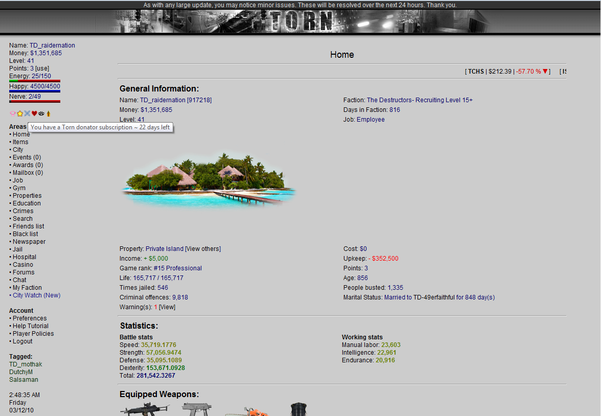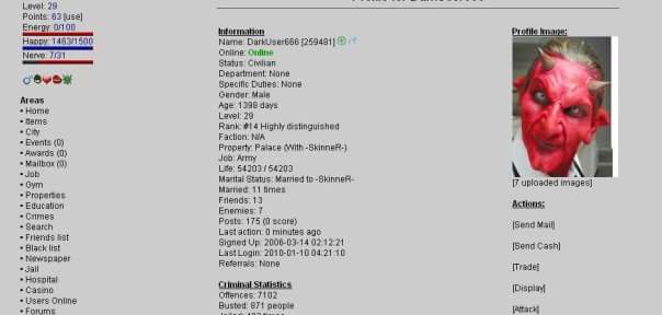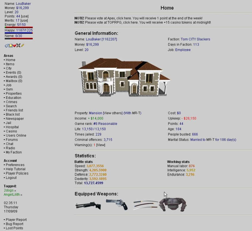 Onwards to 2009, you can witness what the home page tutorial used to look like with this link here. But our next screenshot, originally taken by LouBaker, showcases parts of how Torn had evolved by this point. For example, property “tax” had become the upkeep we have today, and weapons were accompanied by graphics rather than being represented by a plain line of text. Oh, and congrats to Lou on the 666 busts. Ave Satanas.