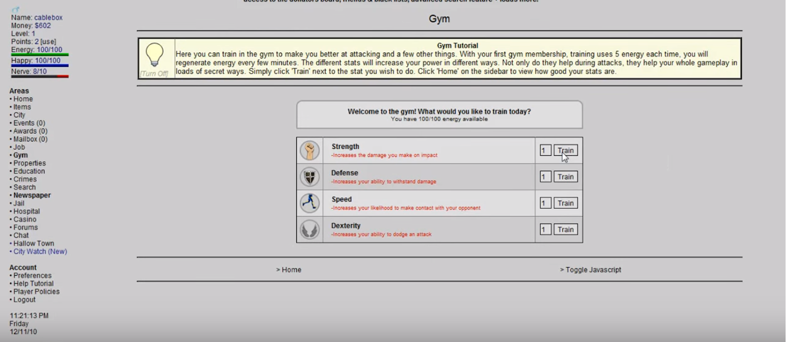 By 2010, the gym had evolved away from being a dropdown menu. I, for one, am glad Torn did away with those yellow tutorial messages too. So garish!