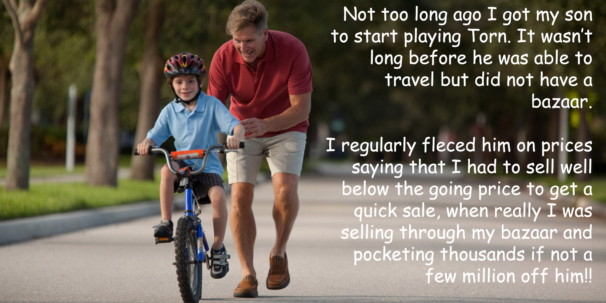 But you sir, you have sullied this moment of familial intimacy with your wanton avarice. This is not to be confused with wonton avarice, which I often have late on Thursdays. It is my judgement that to bring true happiness to your family, you must increase your son's pocket money by 100%, or purchase for him a most profitable Torn City company, which will be named "Father's Lament".