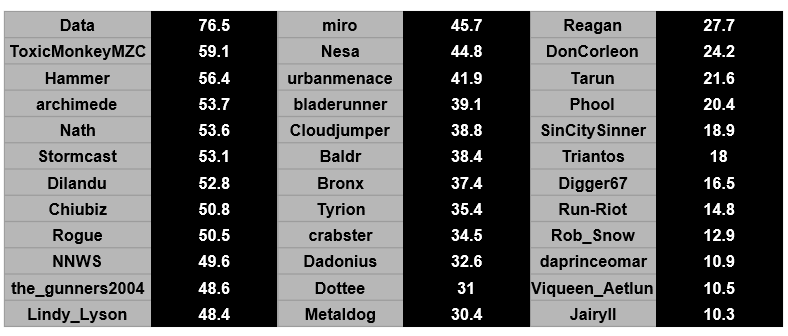 In the end, our thirty-six qualifying drivers came from a range of different skill levels, with Data our top-ranked driver on 76.5, and Jairyll our lowest-ranked driver on 10.3. But as past participants will tell you, your Driver Skill isn't the be-all and end-all, as drivers must also choose the right setup for every one of Torn's sixteen unique race tracks.