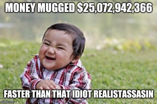 How much have you made from mugging other players? $100 million? $500 million? A billion? Try $25 billion, because that's how much realistassasin has earned from rifling through the pockets of other players, most of which was collected over the past year!