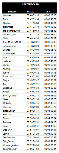 Our Winter Rally champion was Hammer, who ended the competition with a lead of 40.78 seconds over his nearest challenger, Data. Hammer had a decent start to the tournament and was second after two races, but a disastrous last-place finish in the third race at Uptown looked to have put a major dent in his title challenge.