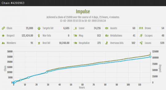 Valgys of Impulse believes his faction holds the record, though, as he claims that they racked up a 25k chain at just 1.2 million respect back in 2019. We know for sure that this chain was completed, but we have no supporting evidence which shows the level of respect they had at the time. If anyone has any screenshots, please send them in!