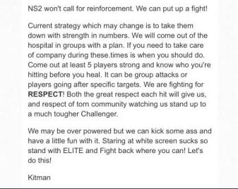 This mailout was sent by Kitman to ELITE's members on Friday. ELITE attacked NS II shortly afterwards and failed to make an impact. Rhino admitted that they lasted longer than UR2, though, adding that "They deserve more respect than UR though, at least they made us work for it rather than throwing in the towel immediately."