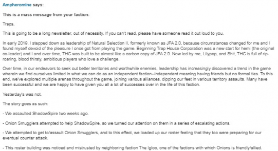 The full mailout can be seen here. It goes on to explain how Cristen of Relentless - reportedly a friend of THC - was given temporary leadership duties in the face of threats from The Igloo. Cristen managed to secure a peace treaty with The Igloo by pretending she had bought THC and that they were now allied to Relentless.