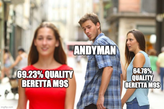I purchased and studied 3,100 Beretta M9s from Big Als and studied the damage/accuracy and respective quality of each. Finding a weapon with exceptional damage OR accuracy is going to be very rare. Finding a weapon with exceptional damage AND accuracy is going to be nothing short of amazing. In fact, if you have a personal goal of obtaining a 90% Beretta M9, the data suggests that your chances of finding one with a total quality percentage higher than 89.99% is around one in nine and a half million. Since we're limited to buying only 100 items a day from Big Als... it will most likely take you around 260 years before you find a +90% quality Beretta M9 to satisfy your goal!