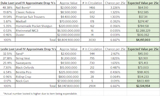 In December 2019, I published my loot tracking data in an attempt to gauge the expected value of using energy in loot raids. One of the variables associated with this study was finding the approximate loot drop rate for each of the items. This loot percentage data is based solely on item circulation data as of the 6th of December, 2019, and I'm aware this methodology isn't perfect for several reasons: Chiefly, the looting community gets antsy on occasion and takes out Duke/Leslie while he is still at Loot Level III.
