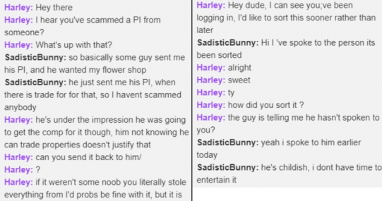 "Thinking the scammer was trustworthy he [the inexperienced player] sent the PI to him, as part of the deal. SadisticBunny then proceeded to block him, leaving the kid helpless. He then contacted me to see if I could solve it. I tried my best to solve the situation amicably, by having bunny send back the private island. Having asked nicely repeatedly, with my words ending in deaf ears, he's left me no choice but to remove him from the faction and brand him a scammer."